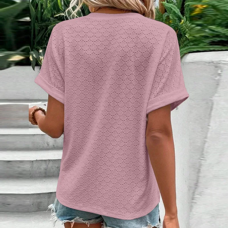 Leve como uma brisa de verão, a blusa traz o equilíbrio perfeito entre conforto e elegância com seu design solto, tecido respirável e delicado decote em V com botões sutis.
